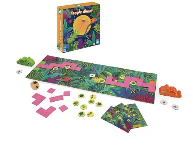Amis caméléons, le dîner est servi ! Soyez le premier à gober la mouche située au centre du plateau dans ce jeu de stratégie sur le thème de la jungle et de ces animaux à la langue si particulière ! Un jeu de société amusant où deux caméléons s'affrontent pour être le plus rapide et le plus malin et attraper leur repas ! Destiné aux enfants à partir de 6 ans, ce jeu de stratégie se joue à 2, en 1 contre 1. Chaque lancé de dé indique le nombre de morceaux de langue (de 1 à 3 cases) qui permettront d'avancer ou l'obstacle à placer pour ralentir son adversaire ! Qui sera le plus stratège ? Rendez-vous au cœur de la jungle tropicale avec ce jeu de société en carton : rires et bons moments garantis ! Ce jeu contient : 1 plateau en carton, 2 caméléons en bois, 1 dé et 91 éléments en carton (langues, pièges, mouches). Ce produit est composé de matériaux certifiés FSC® et de matériaux contrôlés.