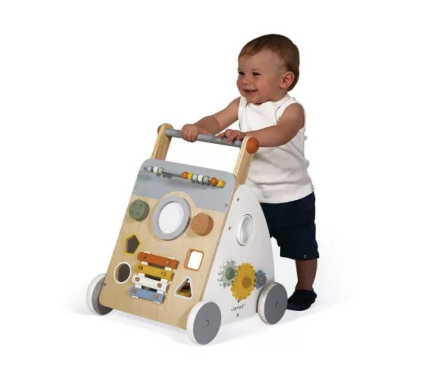 Ce joli chariot multi-activités à pousser est particulièrement adapté à l’apprentissage de la marche. Il accompagnera votre enfant en toute sécurité dès 12 mois : son frein invisible et amovible permet de bloquer les roues et de les libérer progressivement afin de maitriser la vitesse du chariot pendant l’apprentissage. En plus de la marche, votre enfant pourra tester sa motricité fine ainsi que sa dextérité avec les 9 activités ludiques proposées : boulier, boîte à formes, labyrinthe, engrenages, bouton rotatif sonore, "gratte-gratte", miroir rotatif grossissant, tambour et xylophone métal pour développer son éveil musical. Très astucieux, ce chariot d’activité est équipé d’un tapis en feutrine pour atténuer le bruit et amortir la chute des cubes. Enfin, ses roues sont silencieuses ! Si on ajoute à tout ceci, son design contemporain et ses couleurs douces, on ne peut que craquer ! On aime le bois naturel, le blanc et le gris, mis en valeur par les détails colorés des nombreuses activités de ce chariot premier âge pour bébé ! Offrir un chariot de marche multi activités en bois à bébé, c’est lui proposer un jouet deux en un robuste et plein de charme. Un jouet intemporel qui pourra se transmettre de génération en génération, et qui fera craquer toute la famille ! La collection Sweet Cocoon, ce sont des jouets premier âge aux couleurs douces, aux formes arrondies, proposant des activités de découvertes amusantes pour bébé !