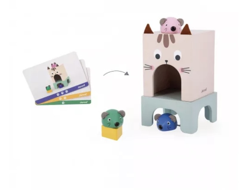 Appréhender les apprentissages de la maternelle tout en s'amusant, c'est la promesse de ce beau jeu éducatif en bois ! Il aidera les plus petits à comprendre les repères dans l'espace et à enrichir leur vocabulaire ! C'est parti pour une course folle entre le chat et les souris ! 3 souris en bois de couleurs différentes, un morceau de fromage et un chat (symbolisé par la boite) attendent les enfants dès 3 ans pour jouer ensemble. En s'appuyant sur les 12 cartes modèles recto-verso, les petits devront reproduire une scène et par la même occasion acquérir le vocabulaire associé : devant/derrière, au-dessus/en-dessous, sur/dans, à l’intérieur de, à côté, entre… Ils développeront également leur sens de l'observation. Il existe 3 niveaux de difficulté représentés par des couleurs sur les cartes. Au fur et à mesure, l'enfant pourra passer de 2 éléments à placer à 6. Ce jeu peut être utilisé en atelier autonome mais également en duo avec un adulte décrivant la scène que l'enfant pourra reproduire en développant ainsi sa compréhension orale.